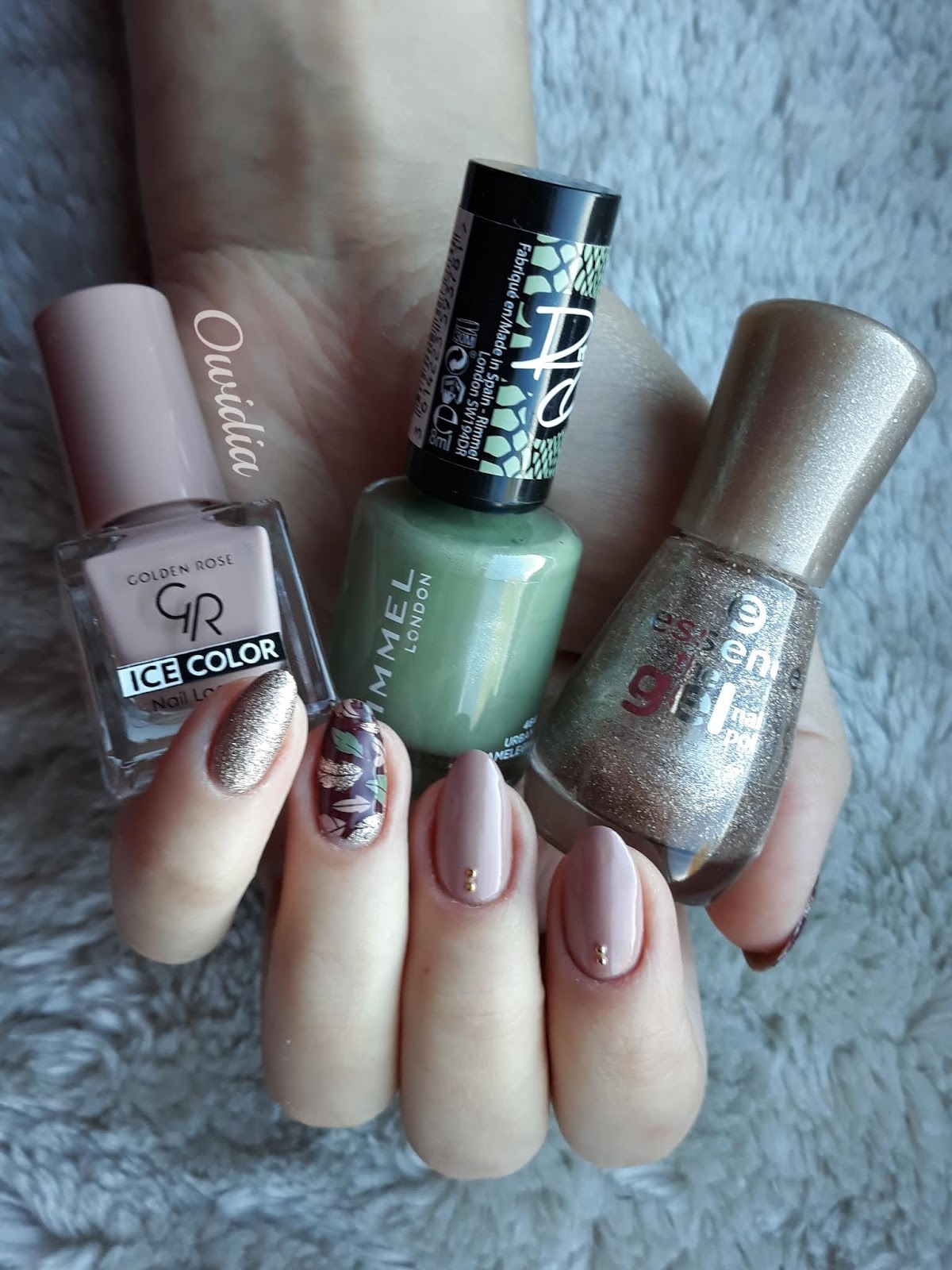 Nie byłam do końca zadowolona ze zdobienia, które dziś wam pokażę. Złotko z essence ma już swoje lata i choć jest bezapelacyjnie moim ulubionym złotkiem w kolekcji, przyszedł na nie czas (kolejna buteleczka już czeka na swoją kolej). Przez glutowatą konsystencję glittera, naklejki są grube i powstały wybrzuszenia... Mimo wszystko te listki mają coś w sobie.